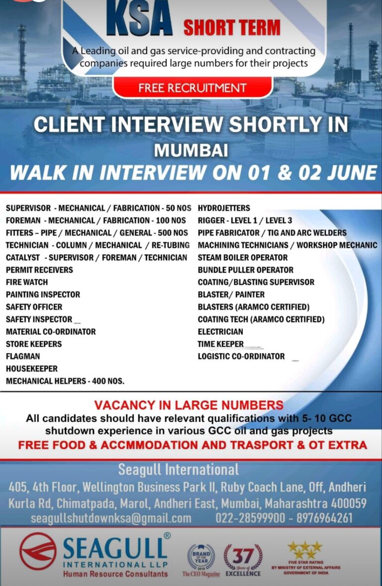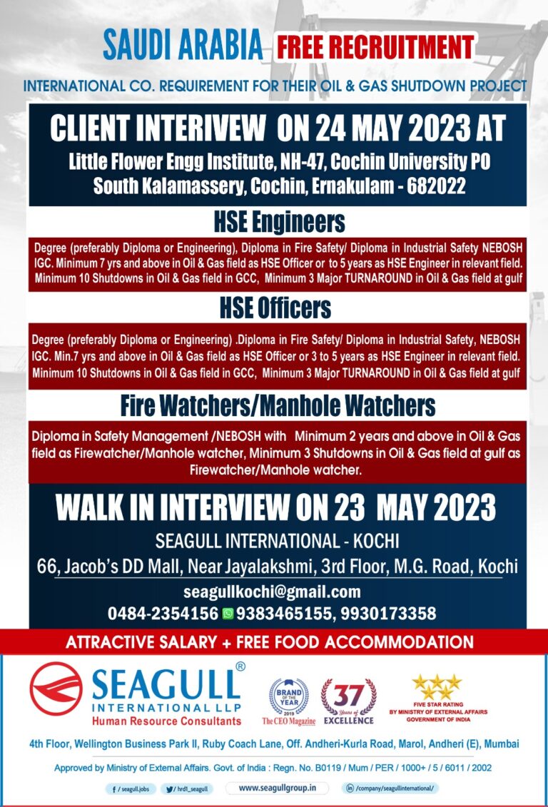 SAUDI ARABIA free recruitmentINTERNATIONAL CO. REQUIREMENT FOR THEIR OIL & GASSHUTDOWN PROJECTCLIENT INTERIVEW ON 24 MAY 2023 ATLittle Flower Ingg …