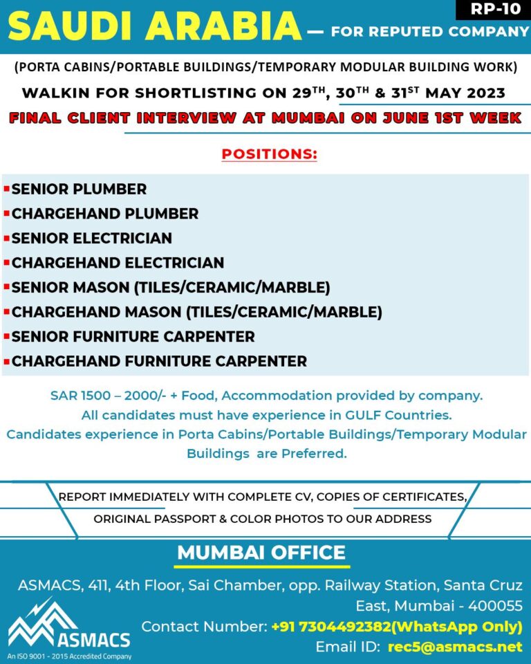 KSA SHORT TERMA Leading oil and gas service-providing and contractingcompanies required large numbers for their projectsFREE RECRUITMENTCLIENT INTERVIEW SHORTLY INMUMBAIWALK …