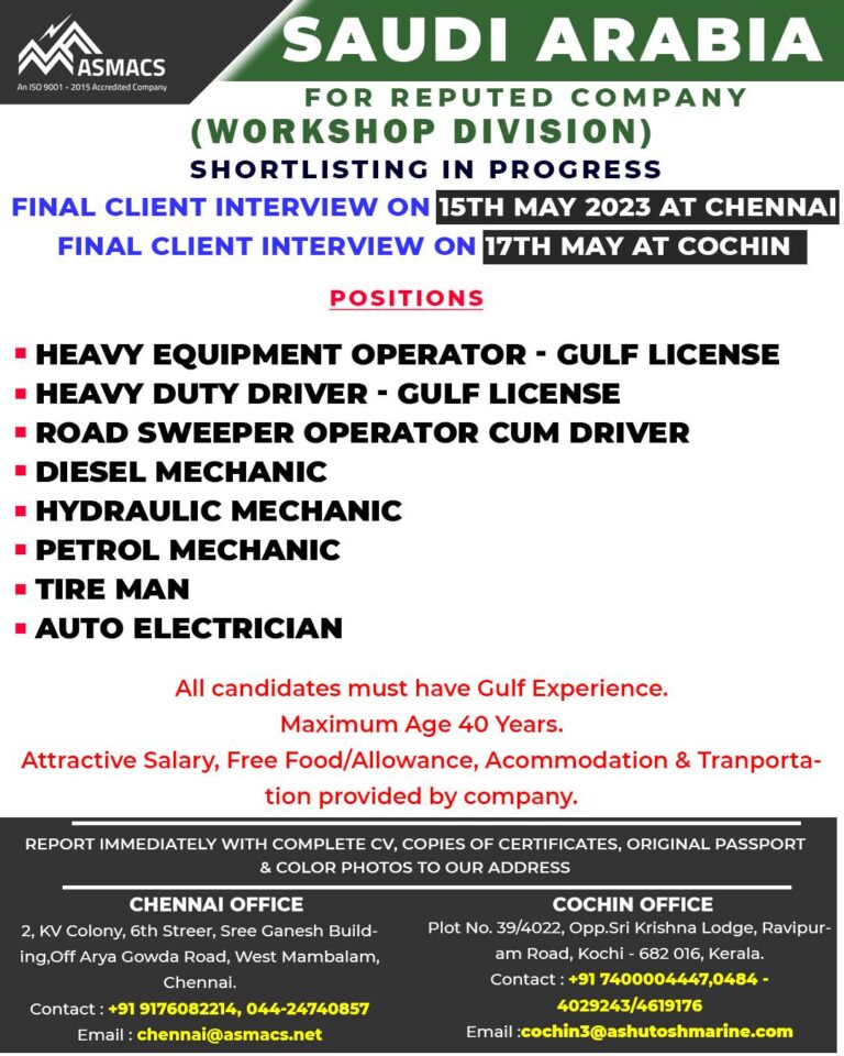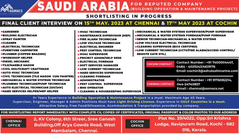 SAUDI ARABIAFOR REPUTED COMPANY(WORKSHOP DIVISION)SHORTLISTING IN PROGRESSFINAL CLIENT INTERVIEW ON 15TH MAY 2023 AT CHENNAIFINAL CLIENT INTERVIEW ON 17TH MAY …
