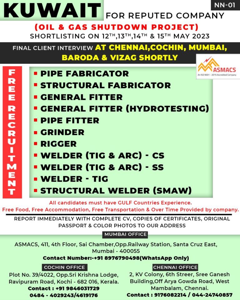 KUWAITFOR REPUTED COMPANY(OIL & GAS SHUTDOWN PROJECT)SHORTLISTING ON 12TH,13TH,14TH & 15TH MAY 2023FINAL CLIENT INTERVIEW AT CHENNAI,COCHIN, MUMBAI, BARODA & …