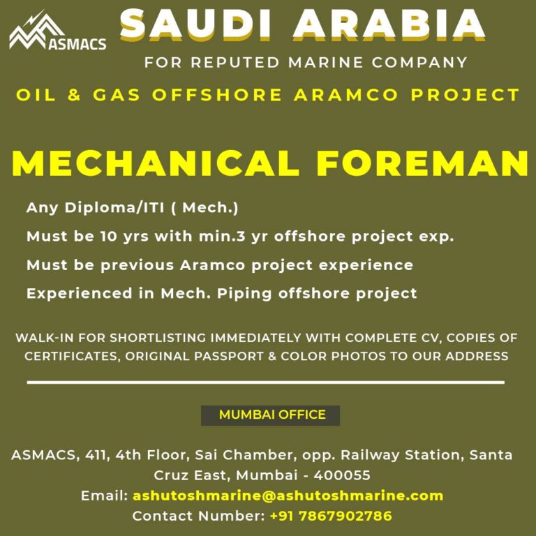 SAUDI ARABIAFOR REPUTED MARINE COMPANYOIL & GAS OFFSHORE ARAMCO PROJECTMECHANICAL FOREMANAny Diploma/ITI ( Mech.)Must be 10 yrs with min.3 yr …