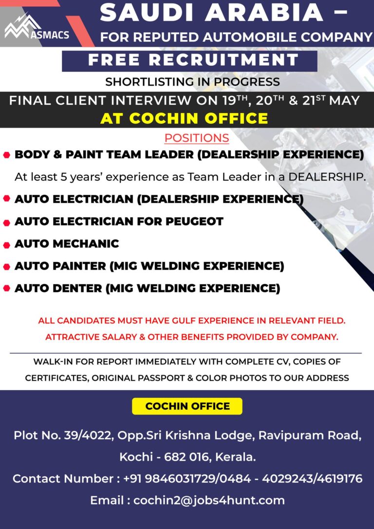 SAUDI ARABIA –FOR REPUTED AUTOMOBILE COMPANYFREE RECRUITMENTSHORTLISTING IN PROGRESSFINAL CLIENT INTERVIEW ON 19TH, 20TH & 21ST MAYAT COCHIN OFFICEPOSITIONS◆ BODY …