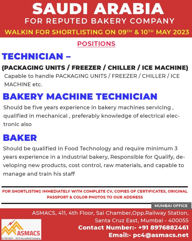 SAUDI ARABIAFOR REPUTED BAKERY COMPANYWALKIN FOR SHORTLISTING ON 09TH & 10TH MAY 2023POSITIONSTECHNICIAN –(PACKAGING UNITS / FREEZER / CHILLER / …