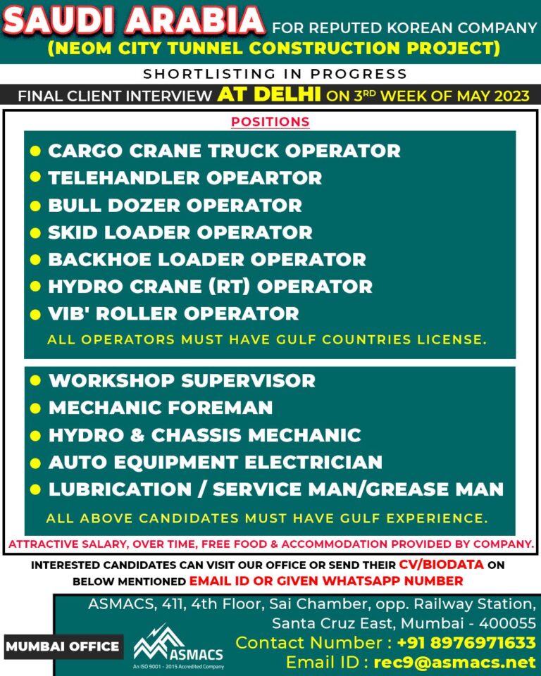 SAUDI ARABIA FOR REPUTED KOREAN COMPANY(NEOM CITY TUNNEL CONSTRUCTION PROJECT)SHORTLISTING IN PROGRESSFINAL CLIENT INTERVIEW AT DELHI ON 3RD WEEK OF …