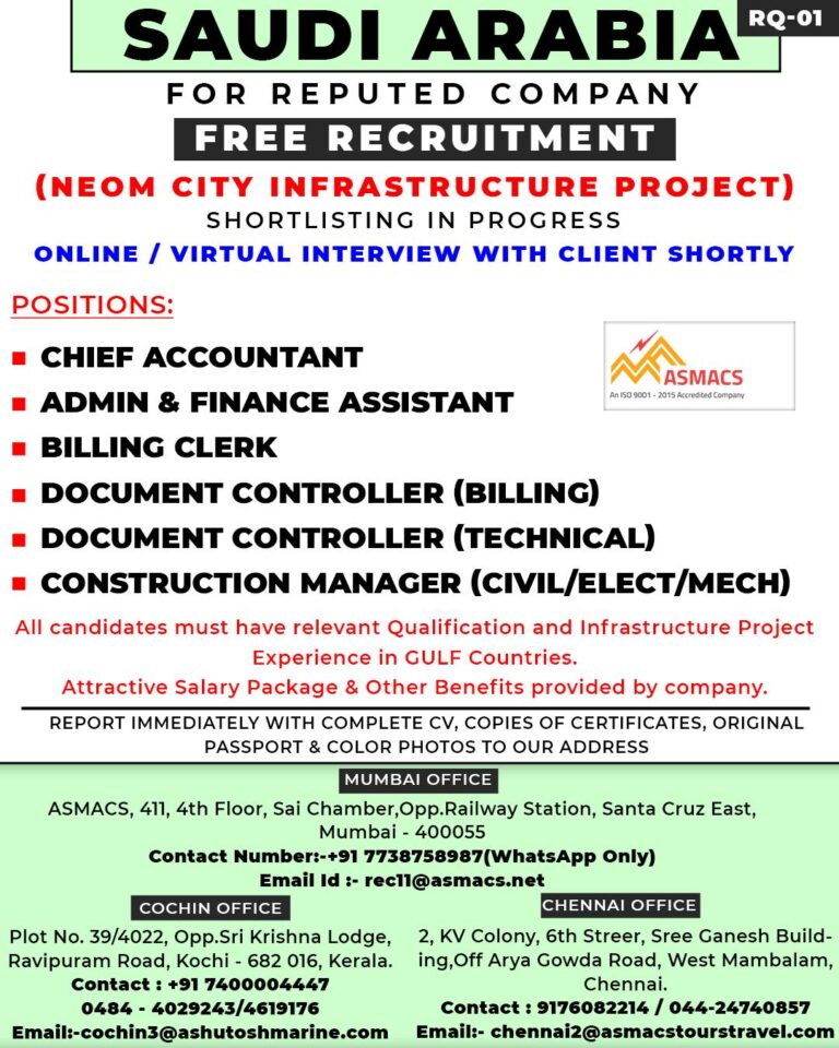 SAUDI ARABIAFOR REPUTED COMPANYFREE RECRUITMENT(NEOM CITY INFRASTRUCTURE PROJECT)SHORTLISTING IN PROGRESSONLINE / VIRTUAL INTERVIEW WITH CLIENT SHORTLYPOSITIONS:■ CHIEF ACCOUNTANT■ ADMIN & …