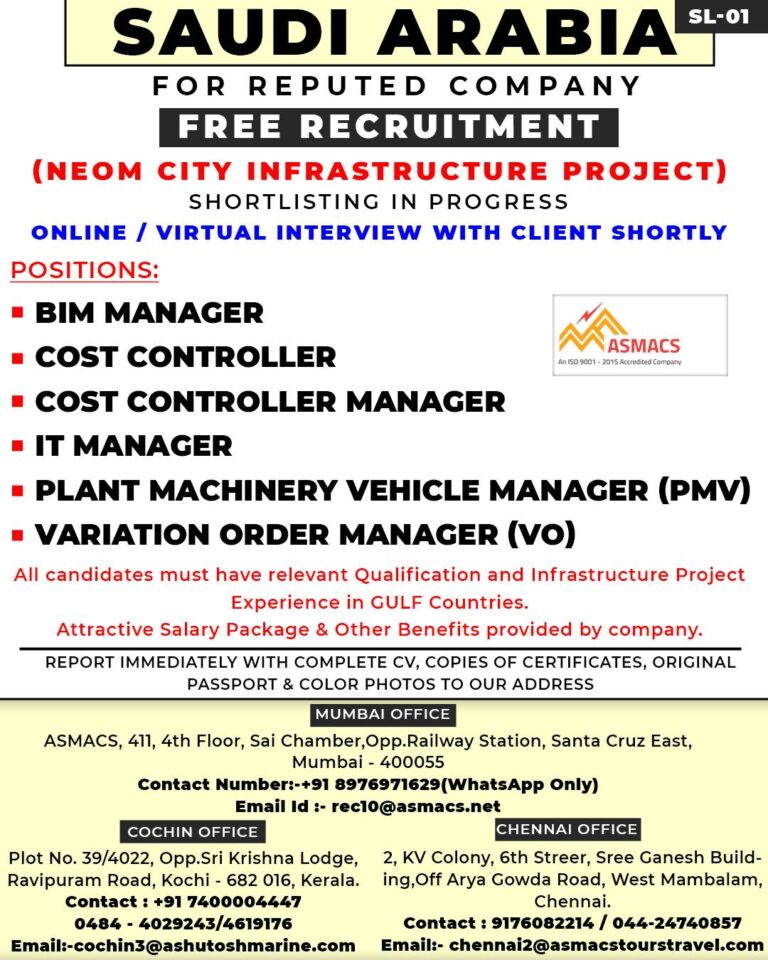 SAUDI ARABIAFOR REPUTED COMPANYFREE RECRUITMENT(NEOM CITY INFRASTRUCTURE PROJECT)SHORTLISTING IN PROGRESSONLINE / VIRTUAL INTERVIEW WITH CLIENT SHORTLYPOSITIONS:▪ BIM MANAGER■ COST CONTROLLERCOST …