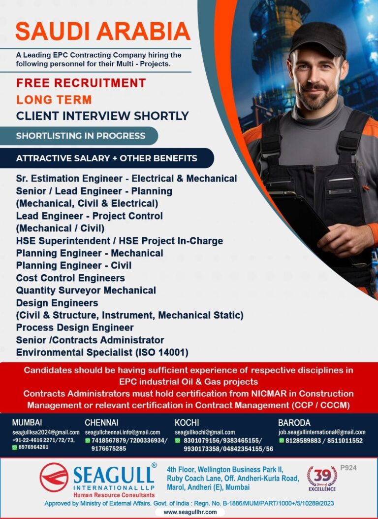 SAUDI ARABIAA Leading EPC Contracting Company hiring thefollowing personnel for their Multi – Projects.FREE RECRUITMENTLONG TERMCLIENT INTERVIEW SHORTLYSHORTLISTING IN PROGRESSATTRACTIVE …