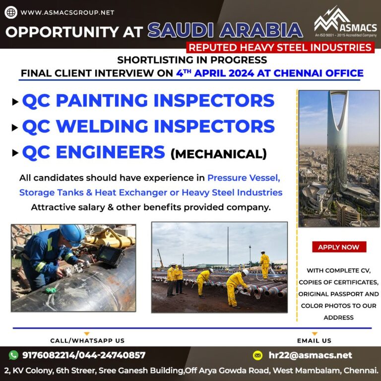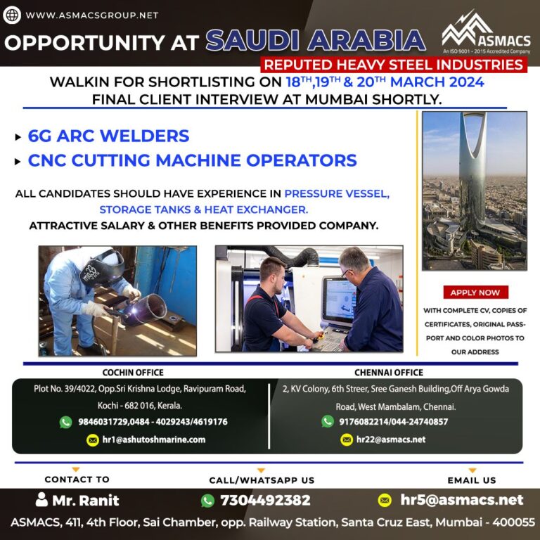 OPPORTUNITY AT SAUDI ARABIA ASMACSAn ISO 9001-2015 Accredited CompanyREPUTED HEAVY STEEL INDUSTRIESSHORTLISTING IN PROGRESSFINAL CLIENT INTERVIEW ON 4TH APRIL 2024 …