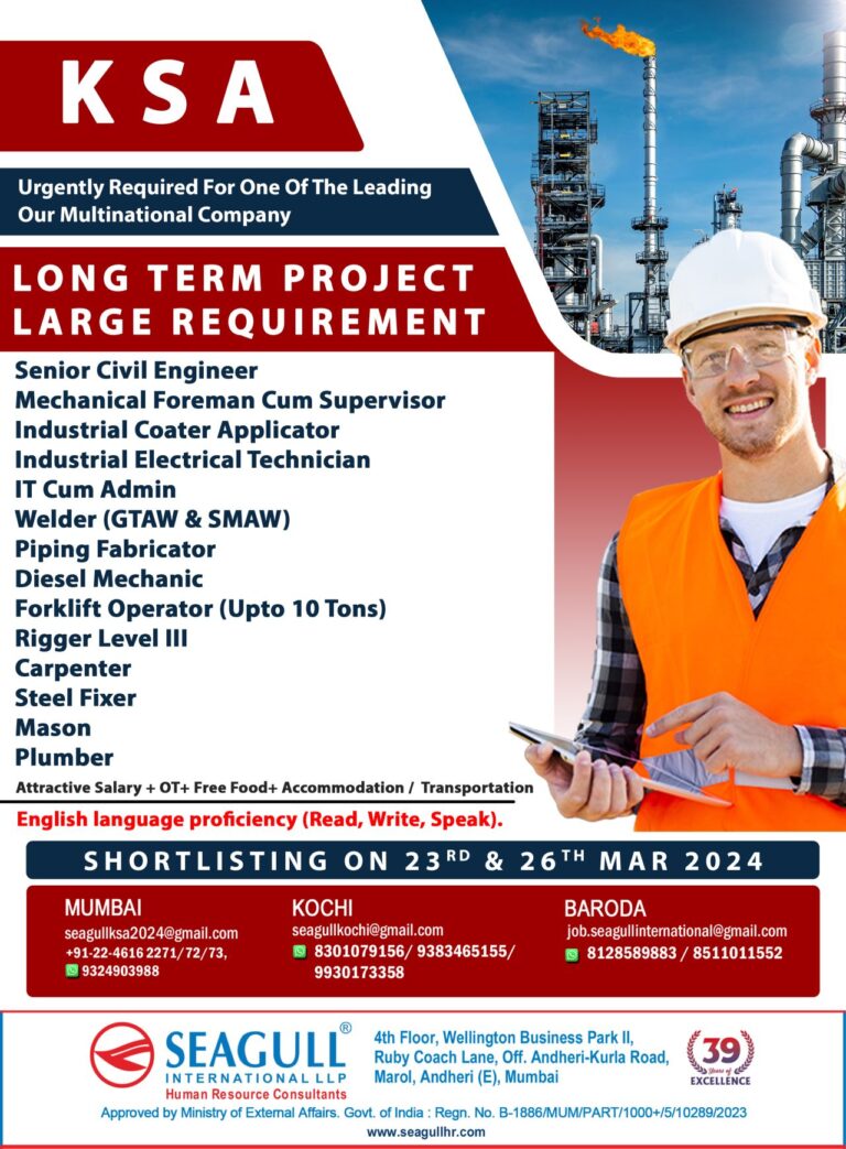 KSAUrgently Required For One Of The LeadingOur Multinational CompanyLONG TERM PROJECTLARGE REQUIREMENTSenior Civil EngineerMechanical Foreman Cum SupervisorIndustrial Coater ApplicatorIndustrial Electrical …