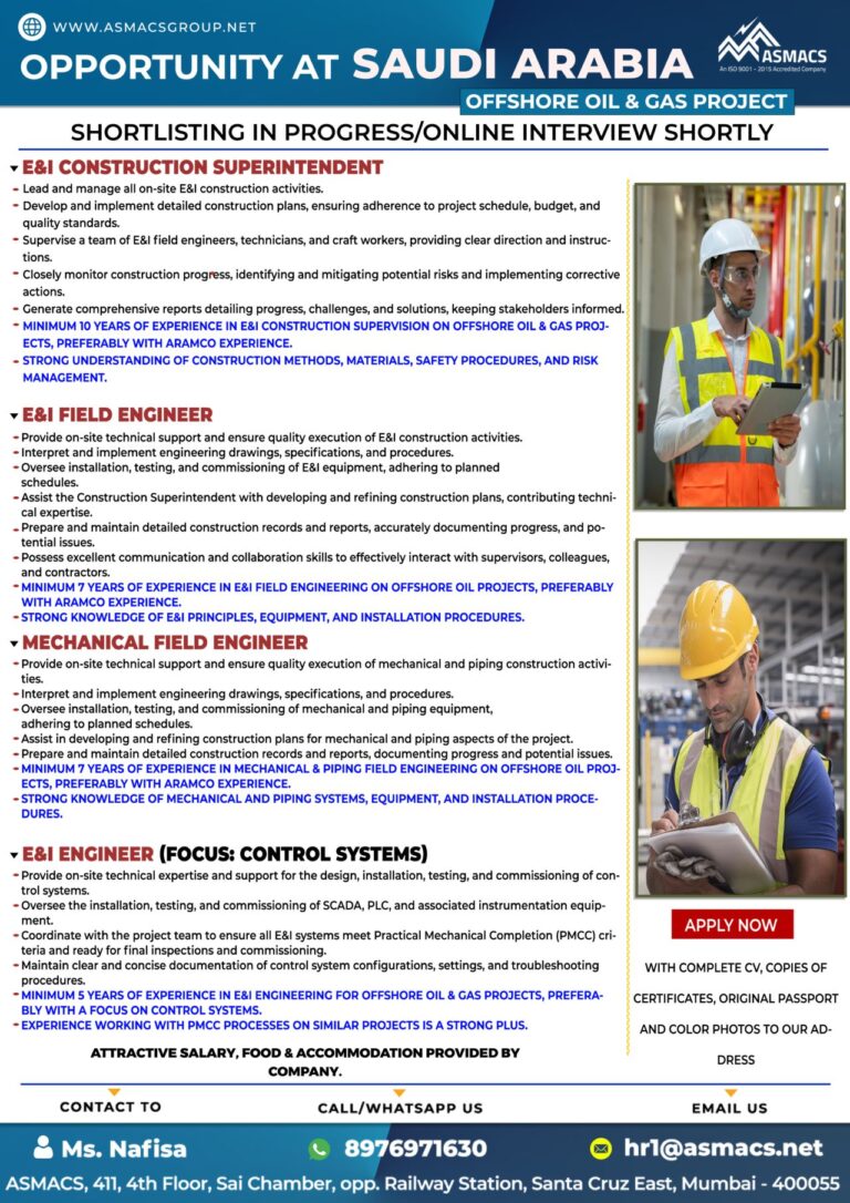 OPPORTUNITY AT SAUDI ARABIA ASMACSAn ISO 9001-2015 Accredited CompanyOFFSHORE OIL & GAS PROJECTSHORTLISTING IN PROGRESS/ONLINE INTERVIEW SHORTLYE&I CONSTRUCTION SUPERINTENDENT Telegram …