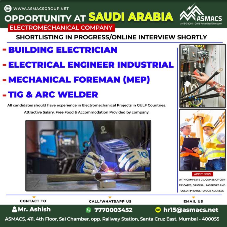 OPPORTUNITY AT SAUDI ARABIAELECTROMECHANICAL COMPANYSHORTLISTING IN PROGRESS/ONLINE INTERVIEW SHORTLYBUILDING ELECTRICIANELECTRICAL ENGINEER INDUSTRIALMECHANICAL FOREMAN (MEP)TIG & ARC WELDERAll candidates should have …