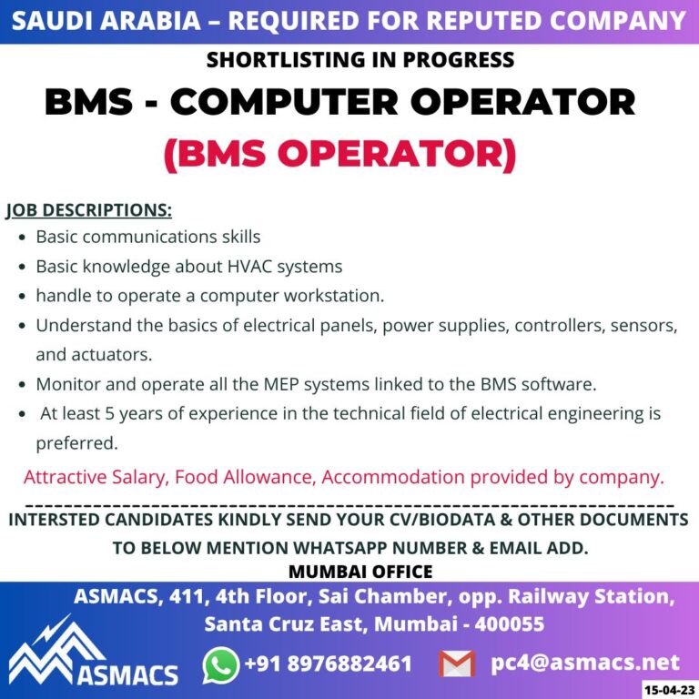 SAUDI ARABIA REQUIRED FOR REPUTED COMPANYSHORTLISTING IN PROGRESSBMS – COMPUTER OPERATOR(BMS OPERATOR)JOB DESCRIPTIONS: Telegram Group Join Now