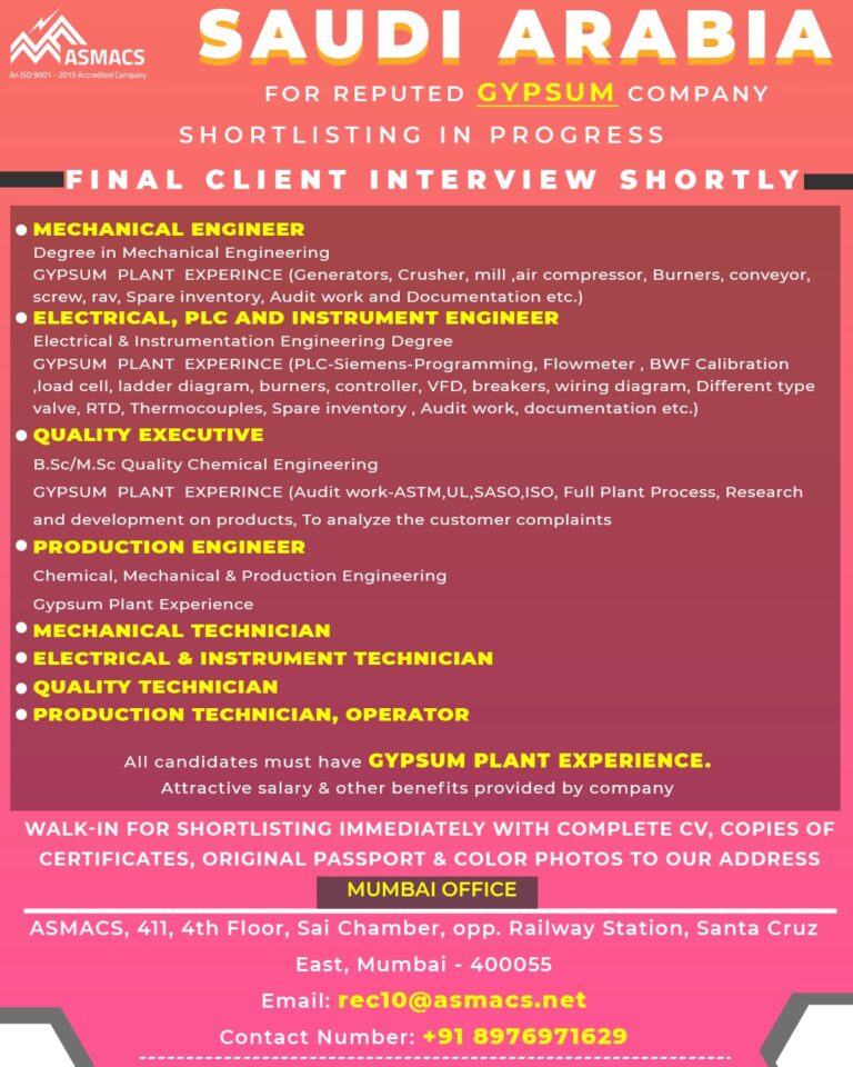 SAUDI ARABIAFOR REPUTED GYPSUM COMPANYSHORTLISTING IN PROGRESSFINAL CLIENT INTERVIEW SHORTLYI Telegram Group Join Now