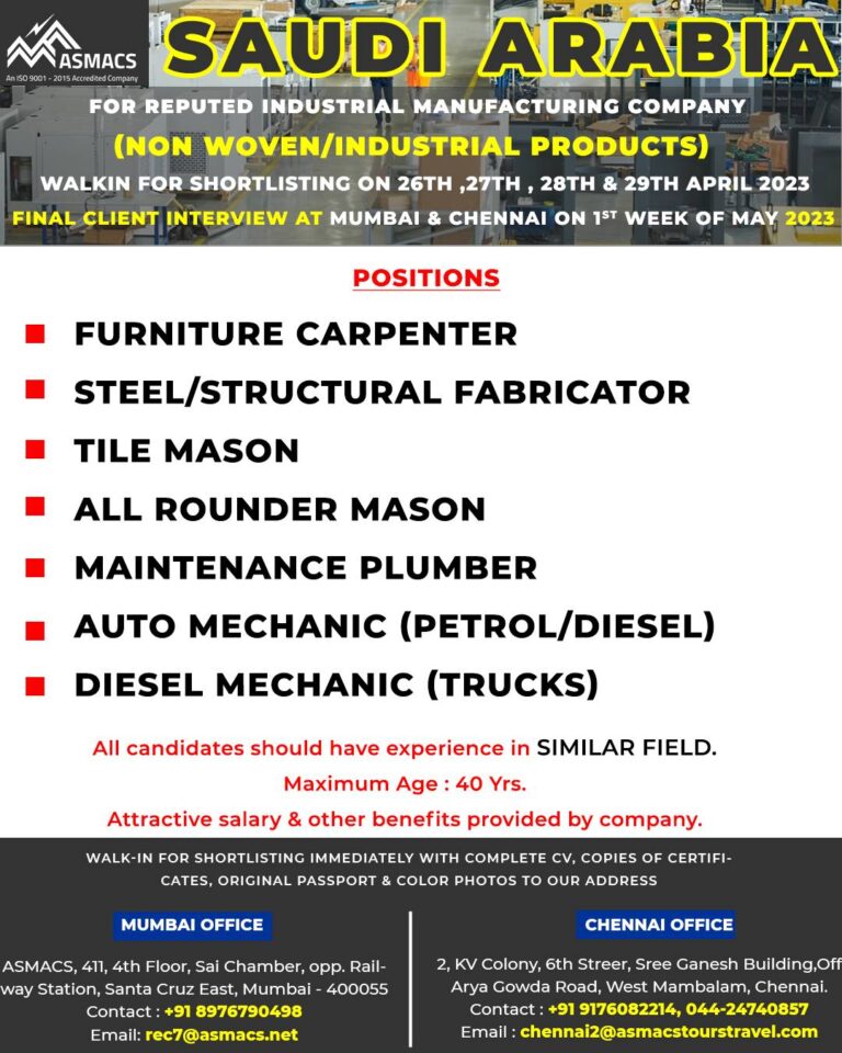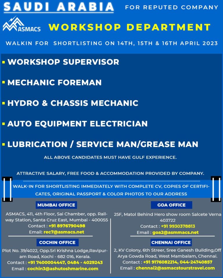 SAUDI ARABIAASMACS WORKSHOP DEPARTMENTWALKIN FOR SHORTLISTING ON 14TH, 15TH & 16TH APRIL 2023 Telegram Group Join Now