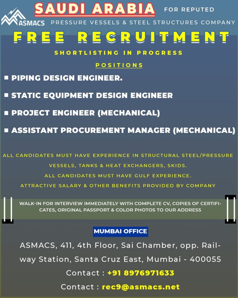 SAUDI ARABIA FOR REPUTEDASMACS PRESSURE VESSELS & STEEL STRUCTURES COMPANYFREE RECRUITMENTSHORTLISTING IN PROGRESSPOSITIONS■ PIPING DESIGN ENGINEER.■ STATIC EQUIPMENT DESIGN ENGINEER■ …