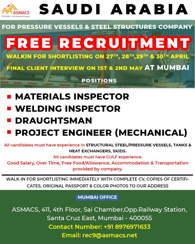 SAUDI ARABIAFOR PRESSURE VESSELS & STEEL STRUCTURES COMPANYFREE RECRUITMENTWALKIN FOR SHORTLISTING ON 27TH, 28TH,29TH & 30TH APRILFINAL CLIENT INTERVIEW ON …