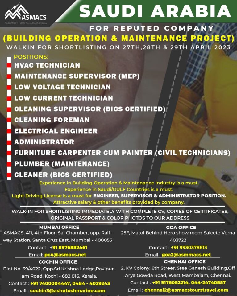 SAUDI ARABIAFOR REPUTED COMPANY(BUILDING OPERATION & MAINTENANCE PROJECT)WALKIN FOR SHORTLISTING ON 27TH, 28TH & 29TH APRIL 2023POSITIONS:HVAC TECHNICIANMAINTENANCE SUPERVISOR (MEP)LOW …