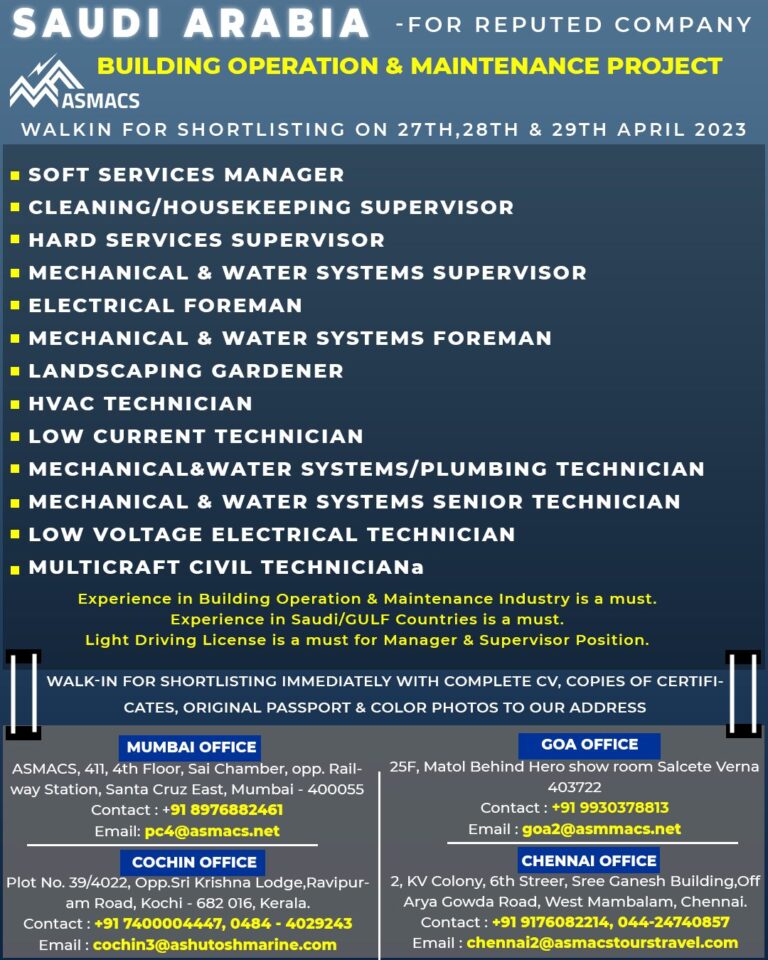 SAUDI ARABIA -FOR REPUTED COMPANYBUILDING OPERATION & MAINTENANCE PROJECTASMACSWALKIN FOR SHORTLISTING ON 27TH,28TH & 29TH APRIL 2023■ SOFT SERVICES MANAGER■ …