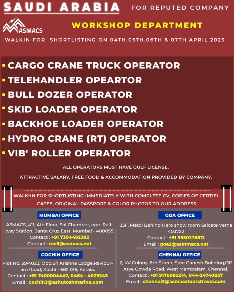 SAUDI ARABIAFOR REPUTED COMPANYWORKSHOP DEPARTMENTWALKIN FOR SHORTLISTING ON 04TH,05TH, 06TH & 07TH APRIL 2023 Telegram Group Join Now