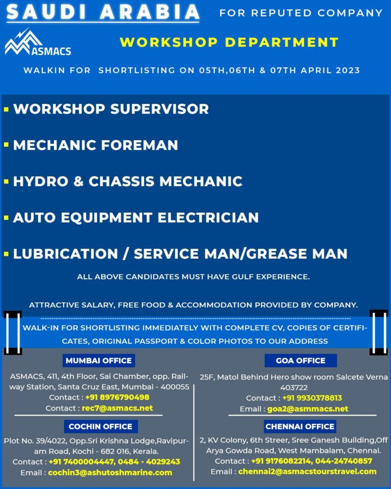 FOR REPUTED COMPANYWORKSHOP DEPARTMENTWALKIN FOR SHORTLISTING ON 05TH, 06TH & 07TH APRIL 2023 Telegram Group Join Now