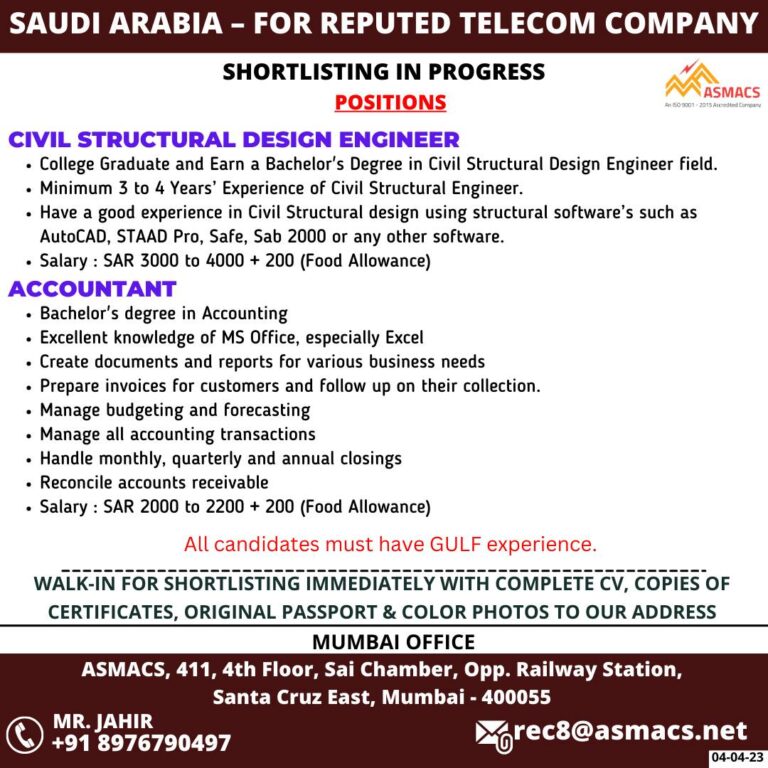 SAUDI ARABIA – FOR REPUTED TELECOM COMPANYSHORTLISTING IN PROGRESSCIVIL STRUCTURAL DESIGN ENGINEERCollege Graduate and Earn a Bachelor’s Degree in Civil …