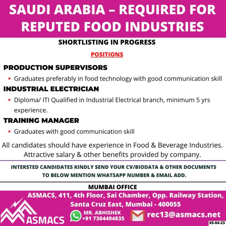 SAUDI ARABIA – REQUIRED FORREPUTED FOOD INDUSTRIESPRODUCTION SUPERVISORS Telegram Group Join Now