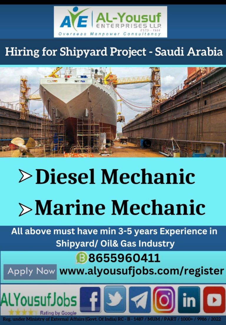 Hiring for Shipyard Project – Saudi Arabia Diesel MechanicMarine MechanicAll above must have min 3-5 years Experience inShipyard/ Oil& Gas …