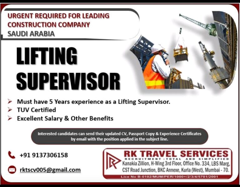 URGENT REQUIRED FOR LEADINGCONSTRUCTION COMPANYSAUDI ARABIALIFTINGSUPERVISORMust have 5 Years experience as a Lifting Supervisor.TUV CertifiedExcellent Salary & Other BenefitsInterested candidates …