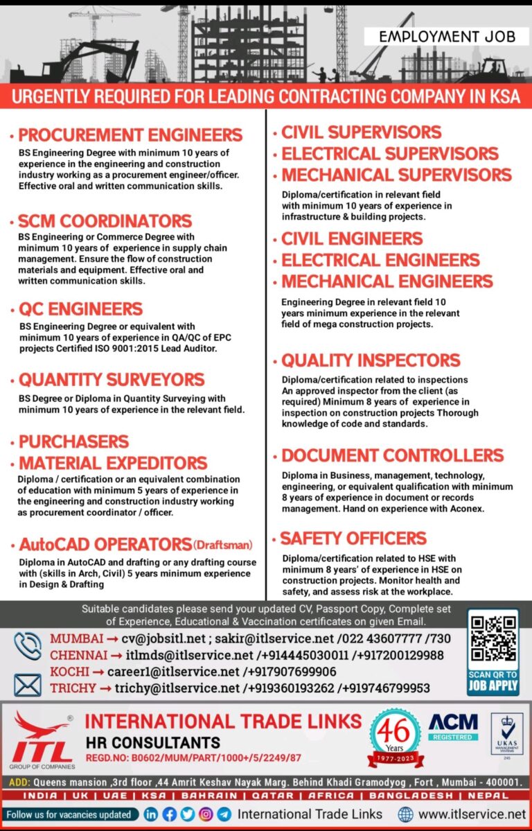URGENTLY REQUIRED FOR LEADING CONTRACTING COMPANY IN KSAPROCUREMENT ENGINEERSBS Engineering Degree with minimum 10 years ofexperience in the engineering and …