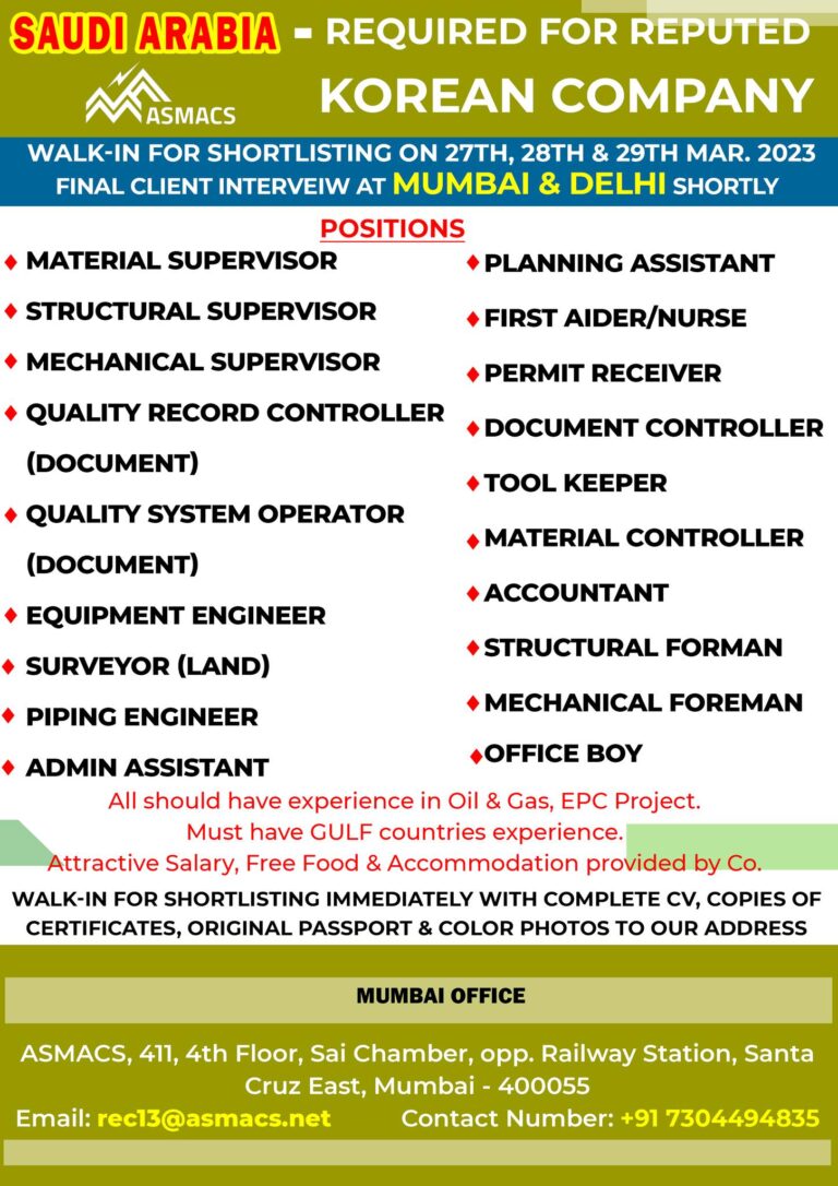 SAUDI ARABIA – REQUIRED FOR REPUTED KOREANCOMPANYASMACSWALK-IN FOR SHORTLISTING ON 27TH, 28TH & 29TH MAR. 2023FINAL CLIENT INTERVEIW AT MUMBAI …