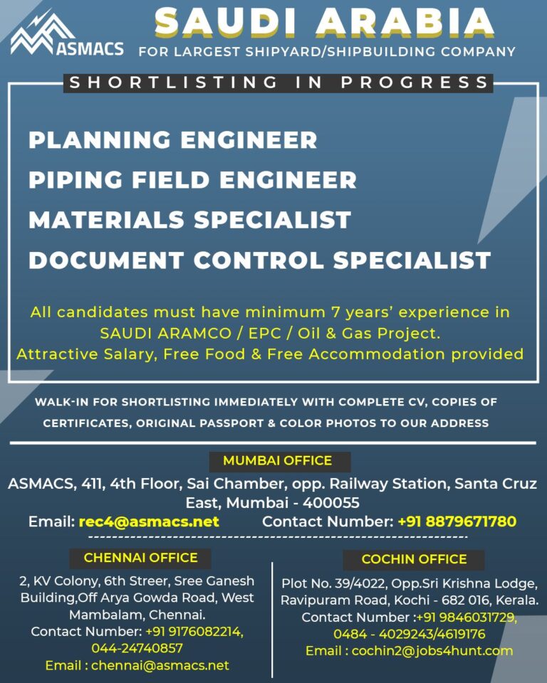 SAUDI ARABIAASMACS FOr largest SHIPYARD/SHIPBUILDING COMPANYSHORTLISTING IN PROGRESSPLANNING ENGINEERPIPING FIELD ENGINEERMATERIALS SPECIALISTDOCUMENT CONTROL SPECIALISTAll candidates must have minimum 7 years’ …