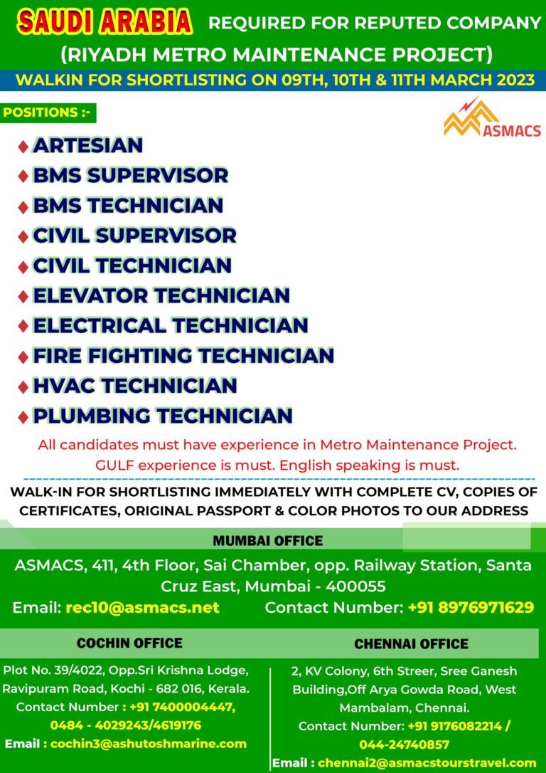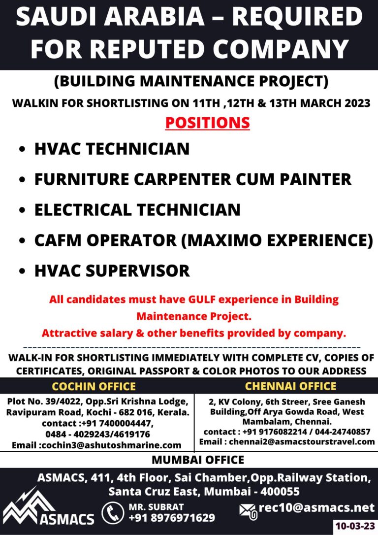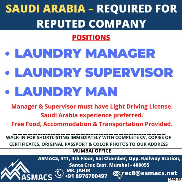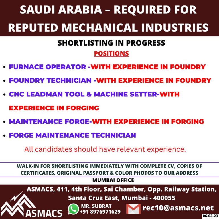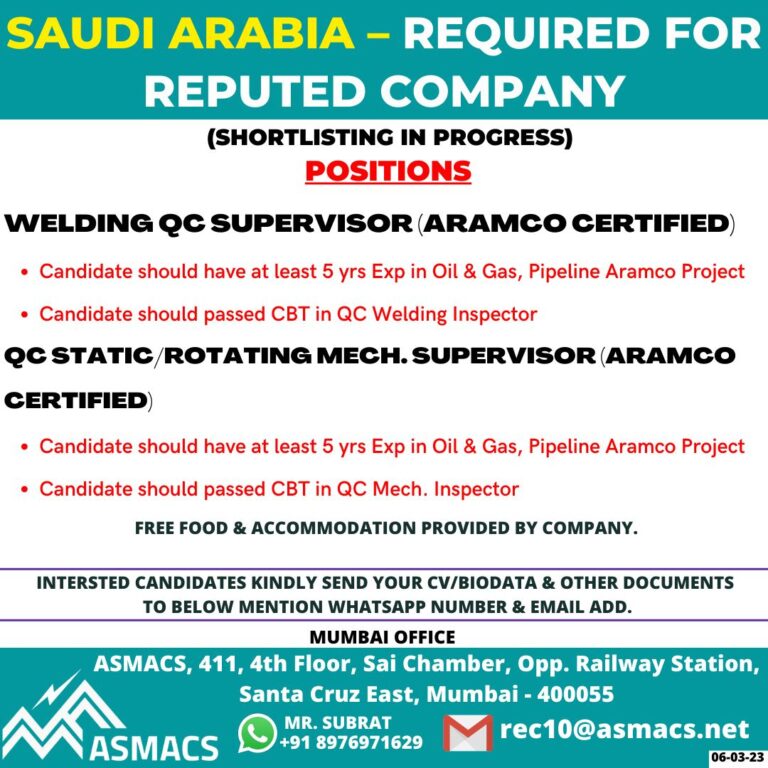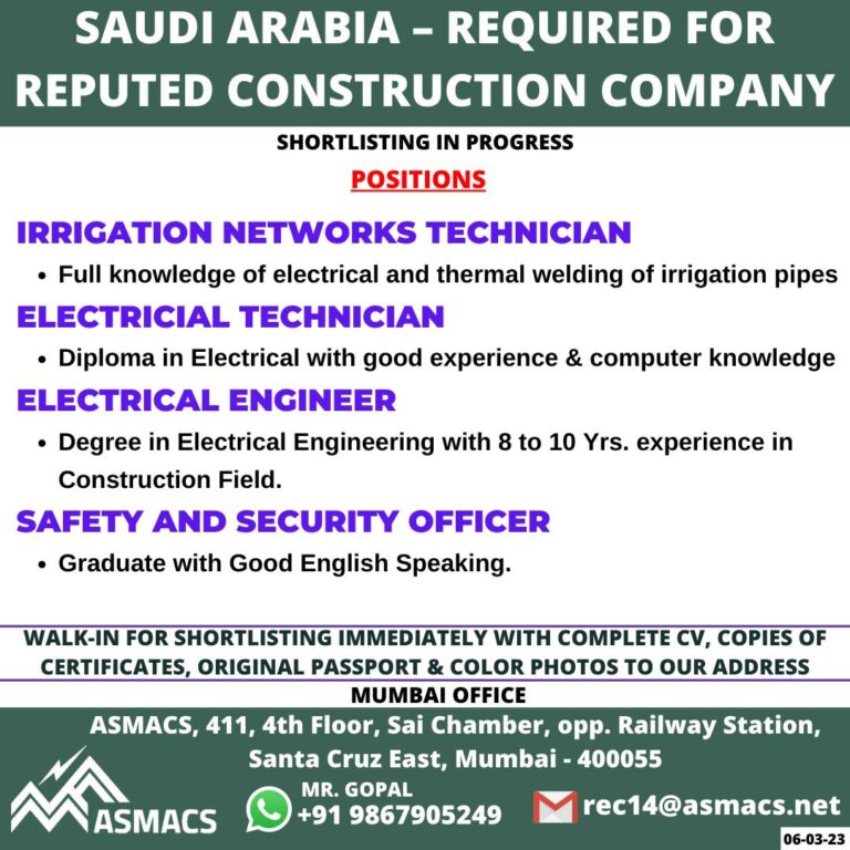 SAUDI ARABIA – REQUIRED FOR REPUTEDSOFT DRINKS/FMCG COMPANYSHORTLISTING IN PROGRESSELECTRICAL SUPERVISORSupervises and implements repairs and maintenance activities related to machineselectrical …