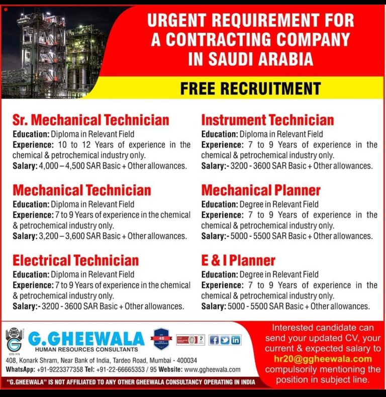 URGENT REQUIREMENT FORA CONTRACTING COMPANYIN SAUDI ARABIAFREE RECRUITMENTSr. Mechanical TechnicianEducation: Diploma in Relevant FieldExperience: 10 to 12 Years of experience …