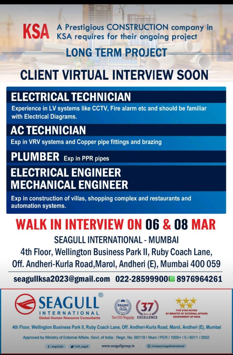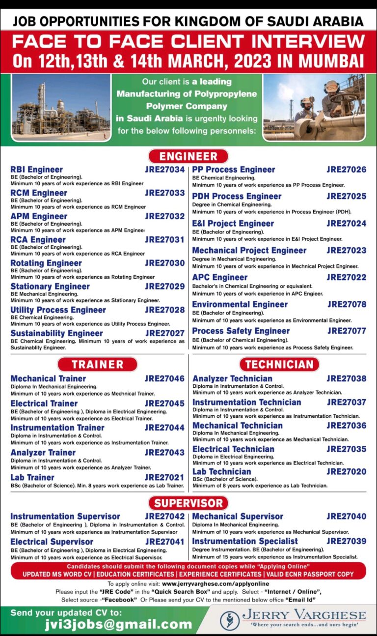 JOB OPPORTUNITIES FOR KINGDOM OF SAUDI ARABIAFACE TO FACE CLIENT INTERVIEWOn 12th, 13th & 14th MARCH, 2023 IN MUMBAIOur client …