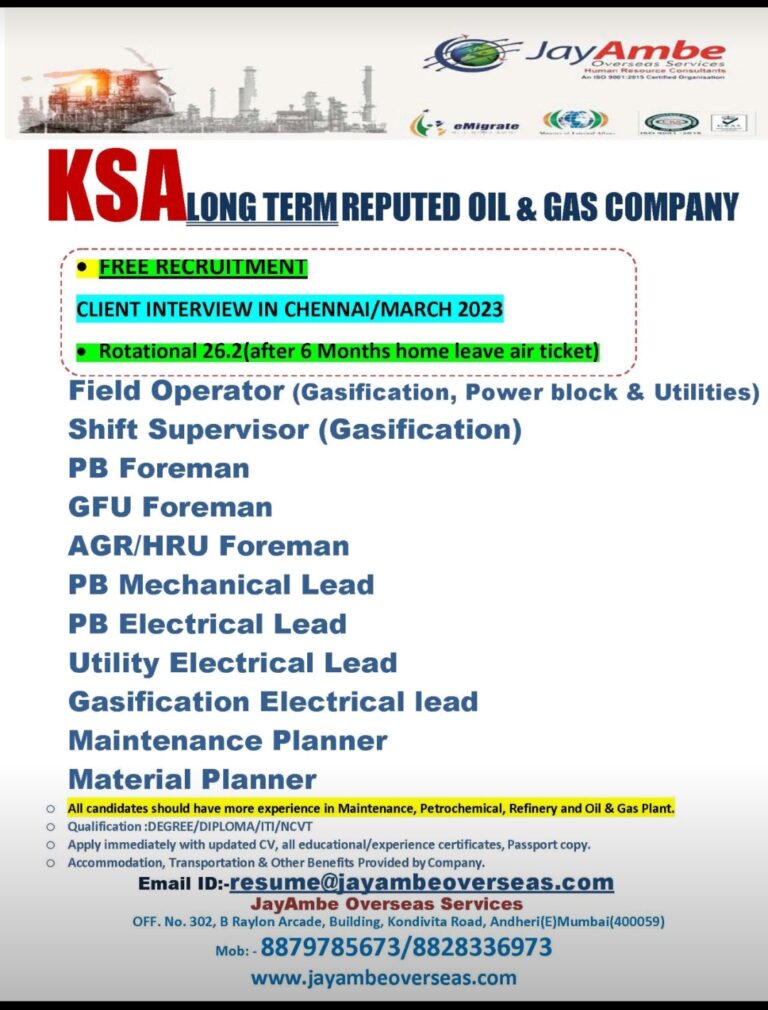 SAUDI ARABIAREQUIRED FOR REPUTED COMPANYPLANTS)(OIL & GAS, PETROCHEMICALWALKIN FOR SHORTLISTING ON 03RD,04TH & 06TH MARCH 2023FINAL CLIENT INTERVIEW AT CHENNAI, …