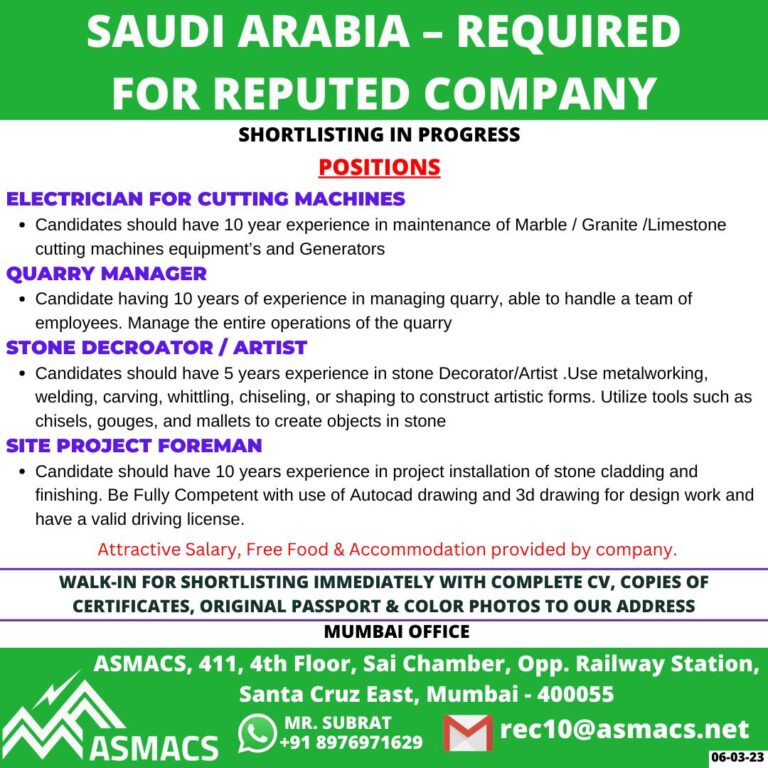 SAUDI ARABIA – REQUIREDFOR REPUTED COMPANYSHORTLISTING IN PROGRESSPOSITIONSELECTRICIAN FOR CUTTING MACHINESCandidates should have 10 year experience in maintenance of Marble …