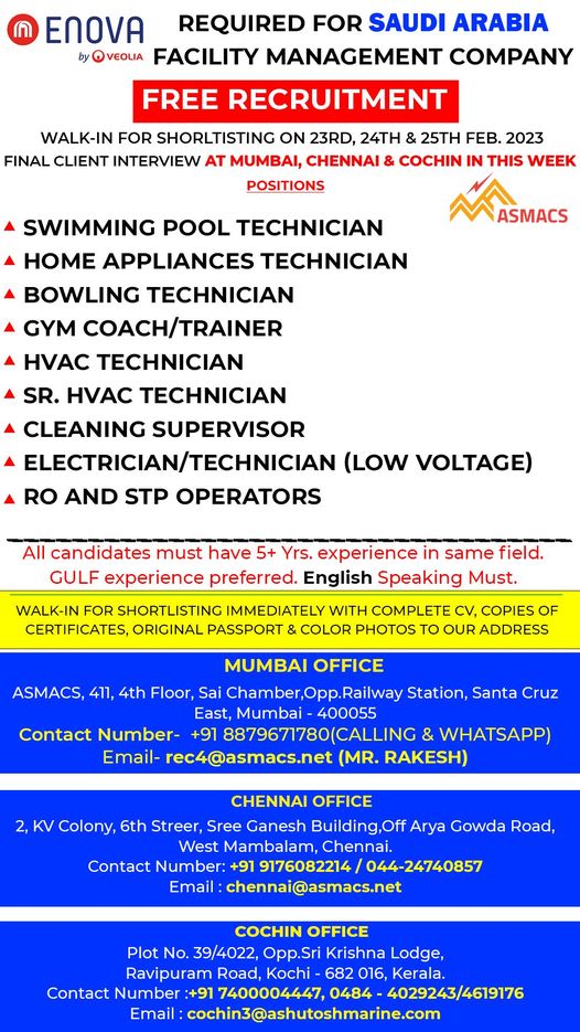 REQUIRED FOR SAUDI ARABIAFACILITY MANAGEMENT COMPANYFREE RECRUITMENTWALK-IN FOR SHORLTISTING ON 23RD, 24TH & 25TH FEB. 2023FINAL CLIENT INTERVIEW AT MUMBAI, …