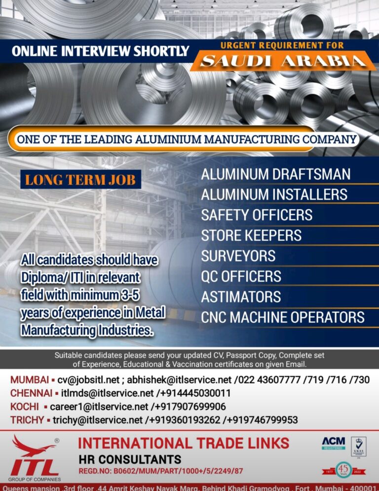 ONLINE INTERVIEW SHORTLYONE OF THE LEADING ALUMINIUM MANUFACTURING COMPANYLONG TERM JOBURGENT REQUIREMENT FORSAUDI ARABIAAll candidates should haveDiploma/ITI in relevantfield with …