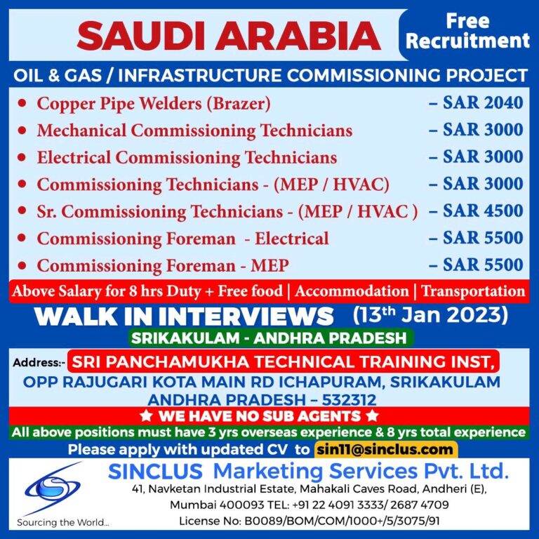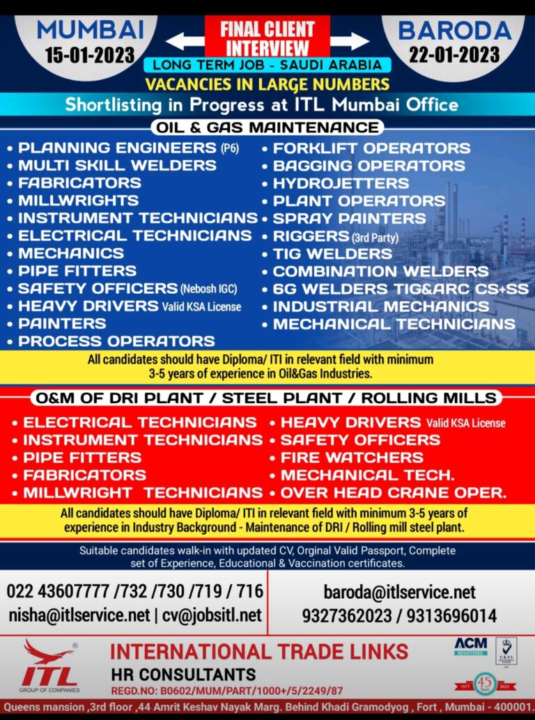 SAUDI ARABIA – REQUIRED FOR REPUTED COMPANYFREE RECRUITMENT(OIL & GAS MAINTENANCE PROJECT)WALKIN FOR INTERVIEW ON 06TH,07TH & 08TH JANUARY 2023FINAL …