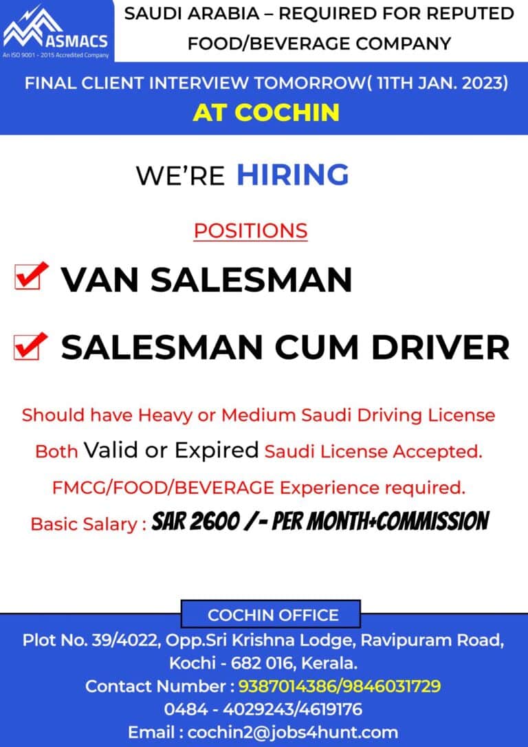 REQUIRED FOR REPUTED COMPANY SAUDI ARABIA FOOD/BEVERAGE COMPANYFINAL CLIENT INTERVIEW TOMORROW( 11TH JAN. 2023)AT COCHINWE’RE HIRINGPOSITIONSVAN SALESMANSALESMAN CUM DRIVERShould have …
