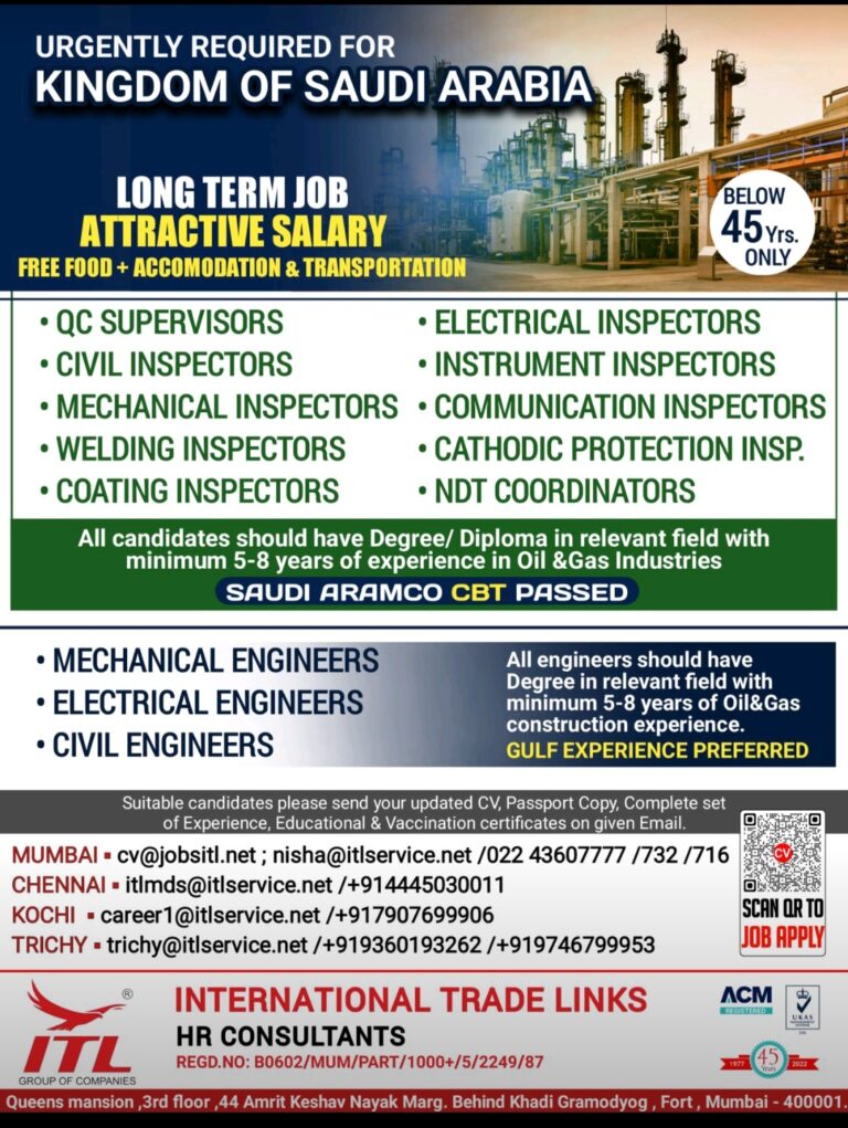 URGENTLY REQUIRED FORKINGDOM OF SAUDI ARABIALONG TERM JOBATTRACTIVE SALARYFREE FOOD+ ACCOMODATION & TRANSPORTATION• QC SUPERVISORS• CIVIL INSPECTORS• MECHANICAL INSPECTORS• WELDING …