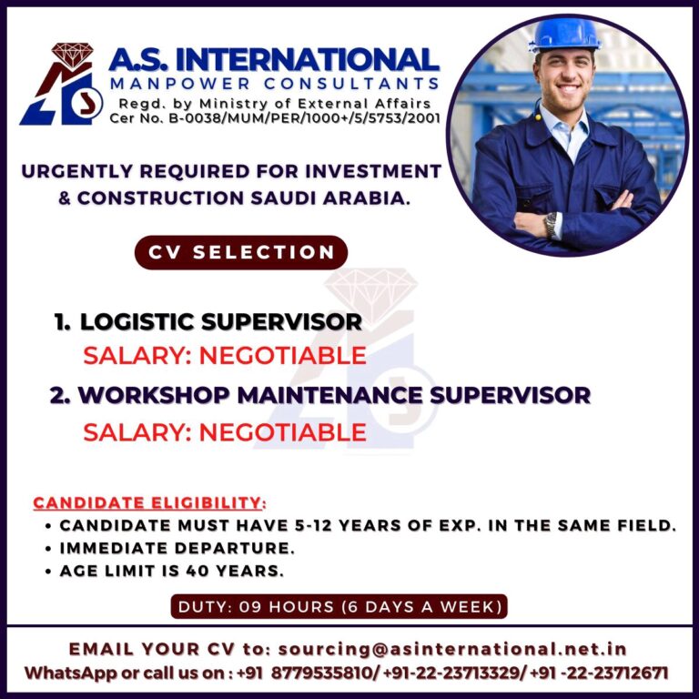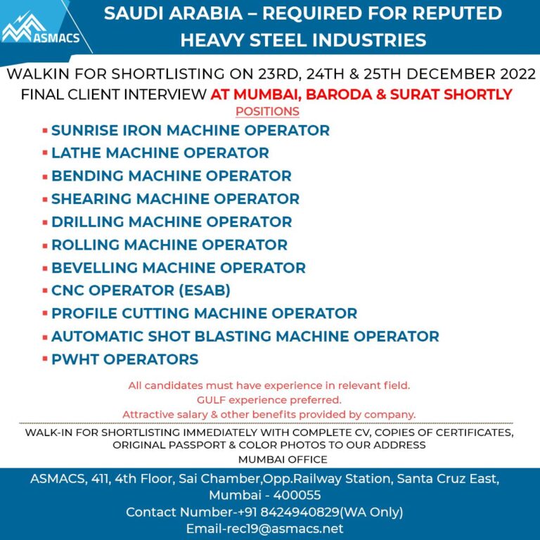 SAUDI ARABIA – REQUIRED FOR REPUTEDHEAVY STEEL INDUSTRIESWALKIN FOR SHORTLISTING ON 23RD, 24TH & 25TH DECEMBER 2022FINAL CLIENT INTERVIEW AT …