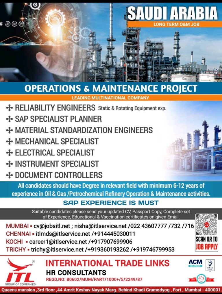 SAUDI ARABIALONG TERM O&M JOBOPERATIONS & MAINTENANCE PROJECTLEADING MULTINATIONAL COMPANY+RELIABILITY ENGINEERS Static & Rotating Equipment exp.+SAP SPECIALIST PLANNER