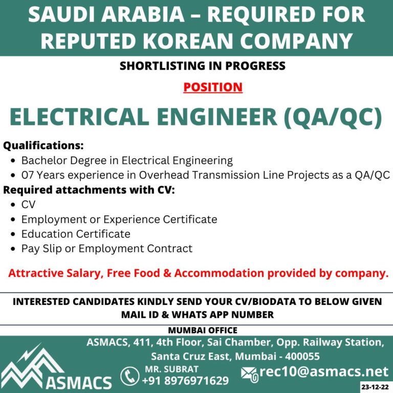 SAUDI ARABIA – REQUIRED FORREPUTED KOREAN COMPANYSHORTLISTING IN PROGRESSPOSITIONELECTRICAL ENGINEER (QA/QC)Qualifications:• Bachelor Degree in Electrical Engineering• 07 Years experience in …