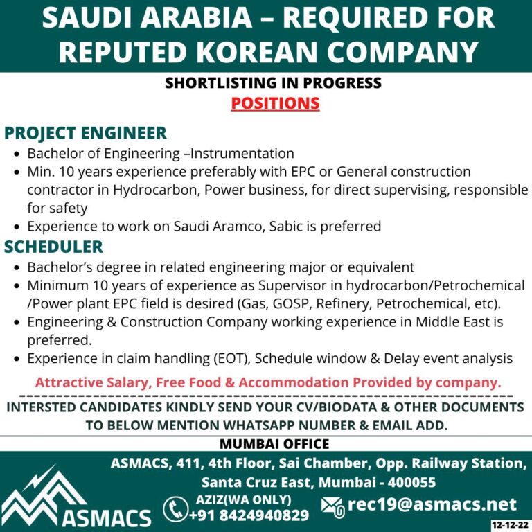 SAUDI ARABIA – REQUIRED FORREPUTED KOREAN COMPANYSHORTLISTING IN PROGRESSPOSITIONSPROJECT ENGINEER• Bachelor of Engineering -Instrumentation• Min. 10 years experience preferably with …