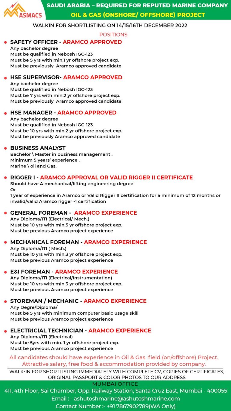 SAUDI ARABIA – REQUIRED FOR REPUTED MARINE COMPANYOIL & GAS (ONSHORE/ OFFSHORE) PROJECTWALKIN FOR SHORTLISTING ON 14/15/16TH DECEMBER 2022POSITIONSSAFETY OFFICER …