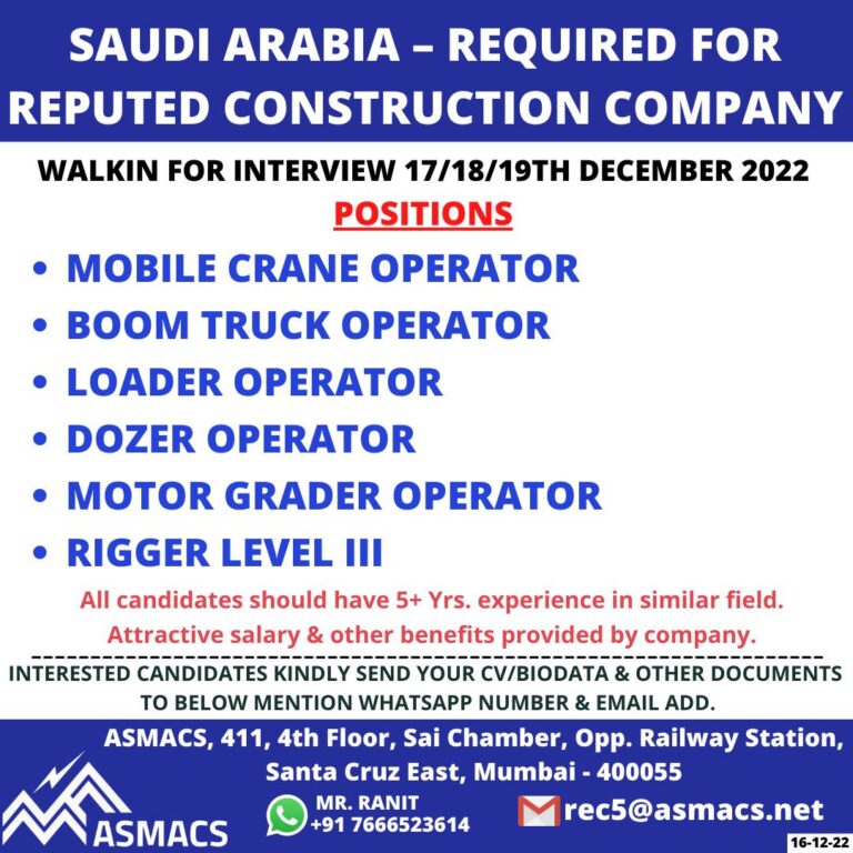 SAUDI ARABIA – REQUIRED FORREPUTED CONSTRUCTION COMPANYWALKIN FOR INTERVIEW 17/18/19TH DECEMBER 2022POSITIONS• MOBILE CRANE OPERATOR• BOOM TRUCK OPERATOR• LOADER OPERATOR• …