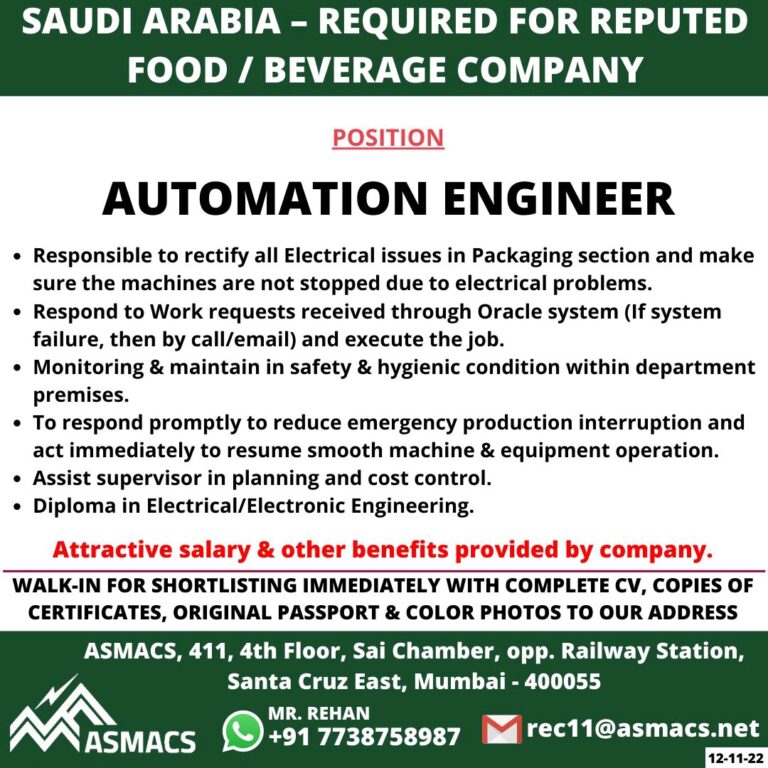 SAUDI ARABIA – REQUIRED FOR REPUTEDFOOD / BEVERAGE COMPANYPOSITIONAUTOMATION ENGINEERResponsible to rectify all Electrical issues in Packaging section and makesure …