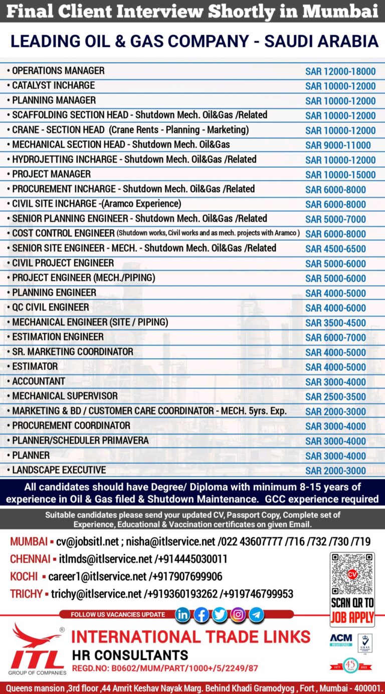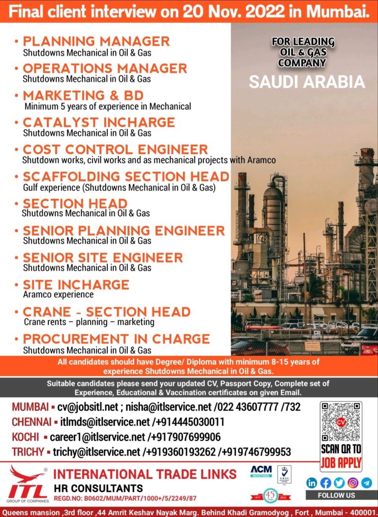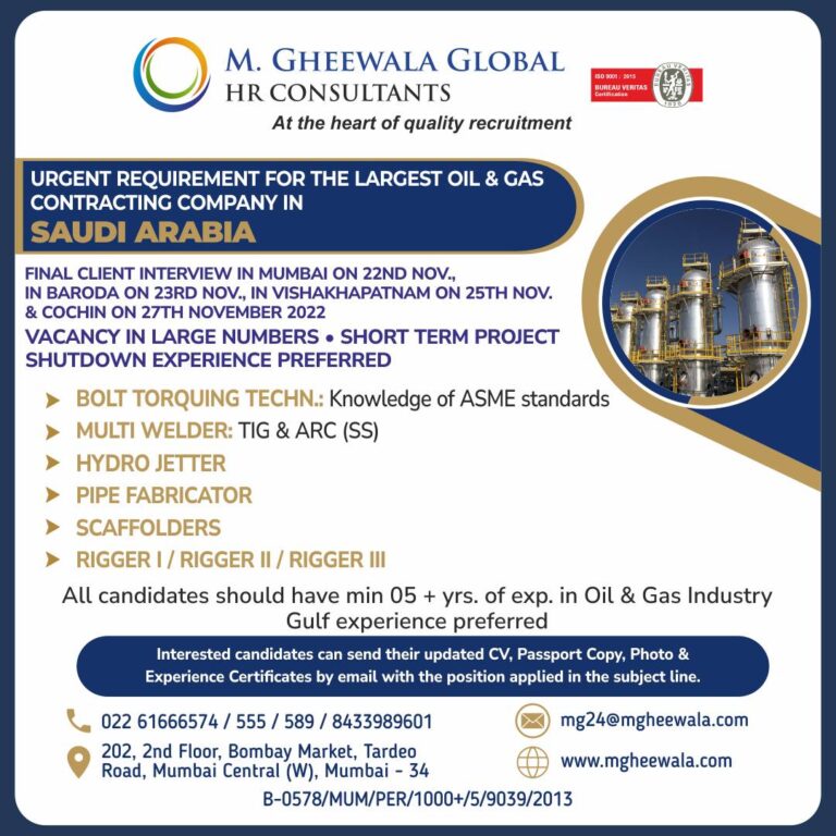 URGENT REQUIREMENT FOR THE LARGEST OIL & GASCONTRACTING COMPANY IN SAUDI ARABIAFINAL CLIENT INTERVIEW IN MUMBAI ON 22ND NOV.,IN BARODA …