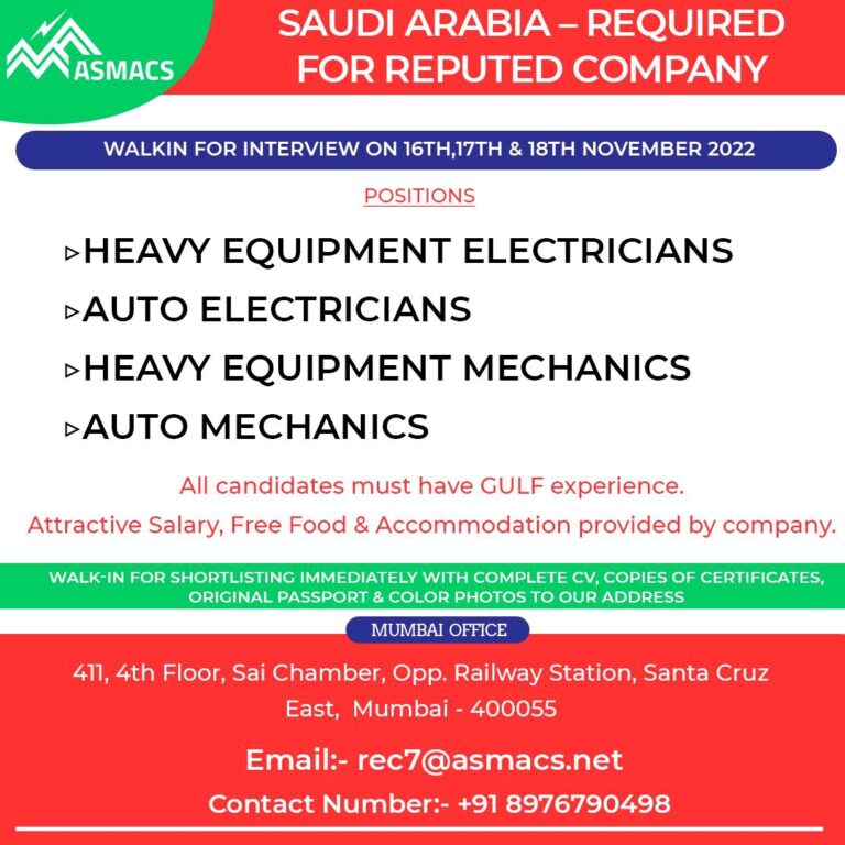 SAUDI ARABIA – REQUIREDFOR REPUTED COMPANYWALKIN FOR INTERVIEW ON 16TH,17TH & 18TH NOVEMBER 2022POSITIONS HEAVY EQUIPMENT ELECTRICIANSAUTO ELECTRICIANSHEAVY EQUIPMENT MECHANICSAUTO …